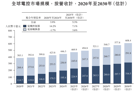 电控市场处于快速扩张阶段,2020年至2024年,全球电控市场规模由人平易近币3,831亿元增至人平易近币4,463亿元,复合年增加率约3。9%;估计2025年至2030年仍将连结约5。3%的复合年增加率不变增加,至2030年市场规模达到约人平易近币6,084亿元。从细分市场看,电机节制器市场规模由2020年的人平易近币1,147亿元增至2024年的人平易近币1,954亿元,复合年增加率达14。2%,次要受新能源汽车发卖快速增加及电动化动力总成渗入率不竭提拔所鞭策。瞻望将来,正在eVTOL、具身智能机械人及新能源汽车市场持续扩张的支撑下,电机节制器市场无望连结不变增加,至2030年达到人平易近币3,165亿元。相较之下,电源转换器市场规模由2020年的人平易近币2,684亿元小幅下滑至2024年的人平易近币2,509亿元,复合年增加率为-1。7%,次要因为家电等保守使用范畴以及其他常规电源转换市场趋于成熟和成长放缓。自2025年起,电源转换器市场无望恢复增加势头,至2030年将扩大至人平易近币2,918亿元,复合年增加率为3。6%,次要受AIDC等新兴使用所鞭策。