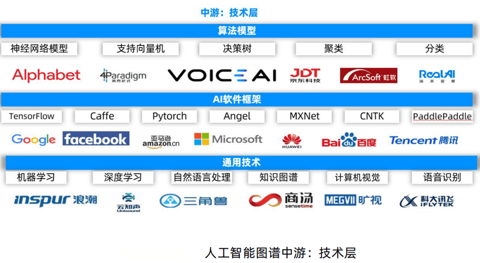 手艺层是AI财产成长的焦点,包罗通用手艺、AI手艺框架以及算法模子等。这一层级依托于海量数据的挖掘处置取机械进修建模,来进行各类使用手艺的开辟,从而处理实践中的具体类别问题。计较机视觉、天然言语处置、语音识别、机械进修、深度进修、学问图谱为这一层级的代表性手艺。劣势企业如谷歌、Facebook加速摆设机械进修、深度进修底层平台,成立财产现实尺度。